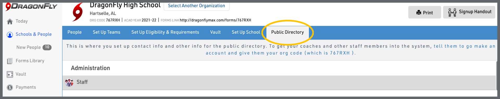 Say goodbye to the days of keeping a heavy directory book on your desk. The Public Directory feature in DragonFly enables schools and organizations to provide a full staff and team list to other schools and associations. If a staff member or team changes, you can update this info in seconds.
