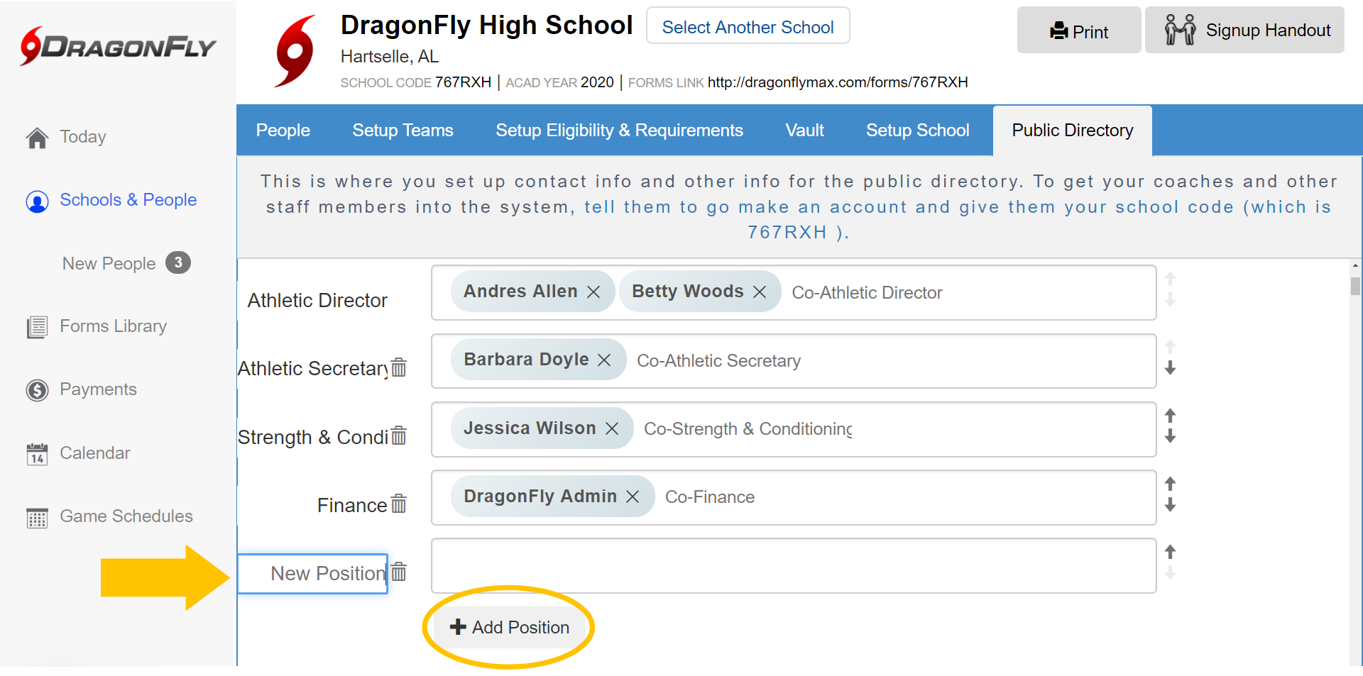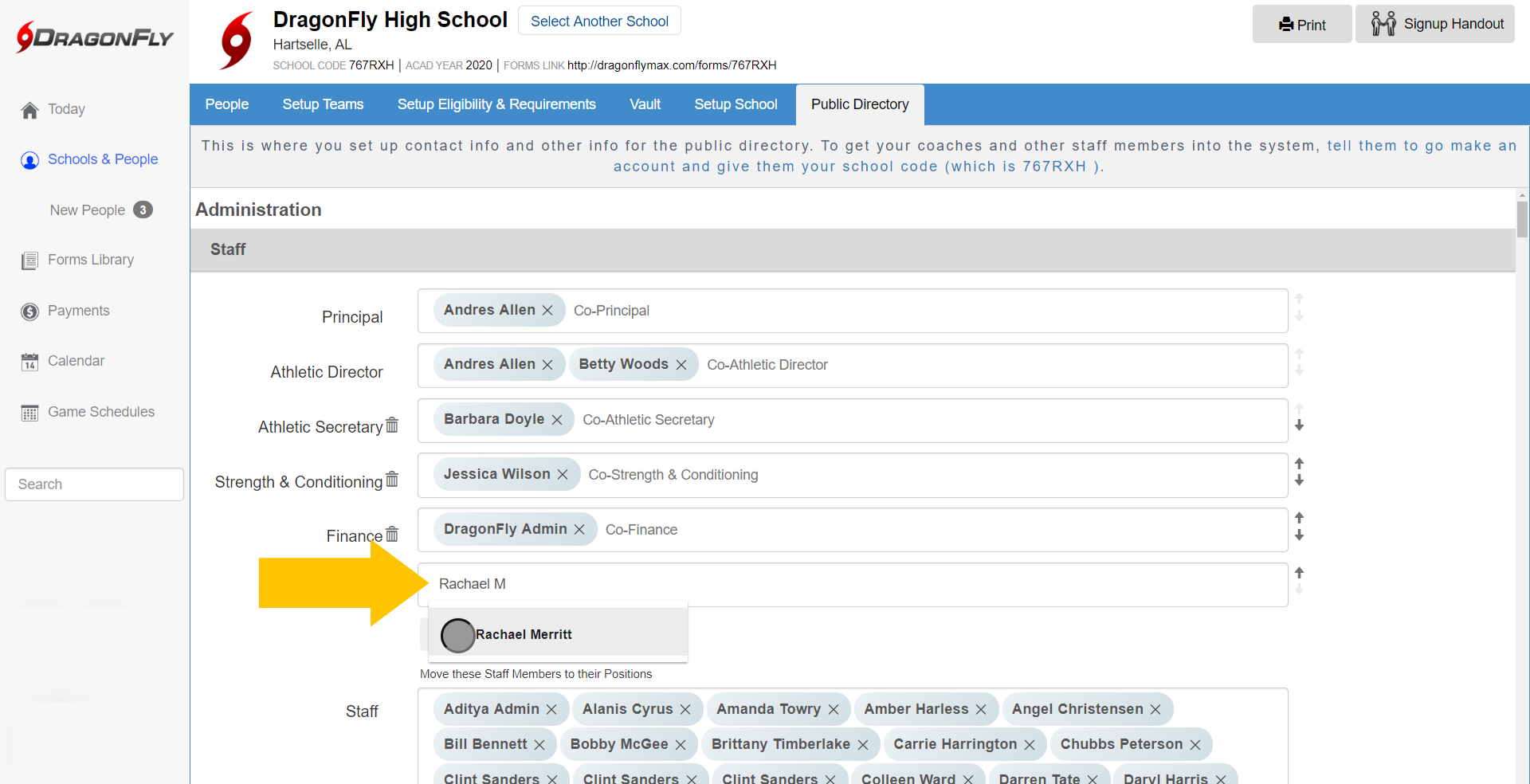 4. If you need to make changes to a name or position, you can either type in a name or drag and drop a name. When you type a name, it should appear in a drop-down menu for you to select if that person has a DragonFly account that is connected to your school. If someone does not have a DragonFly account, you can still enter their name in the directory by typing it in.